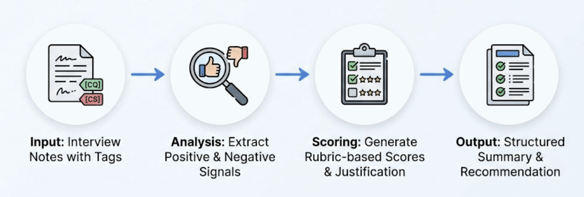 Output: Structured summary with verdict, rubric scores, strengths, concerns, and clear hire/no-hire recommendation.