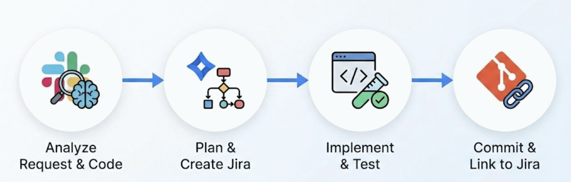 The end-to-end workflow below includes all steps from identifying a problem reported by a user in a Slack thread to implementing, testing, and deploying a solution with full project management integration.