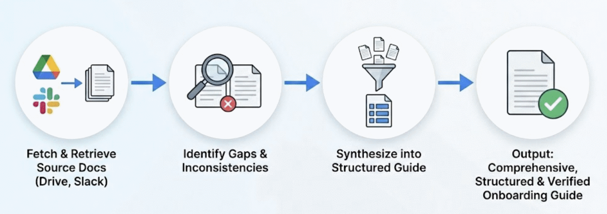 This use-case shows how to use Google Drive and Slack MCP integration to fetch existing documentation, messages, and links from scattered sources and synthesize comprehensive onboarding guides.