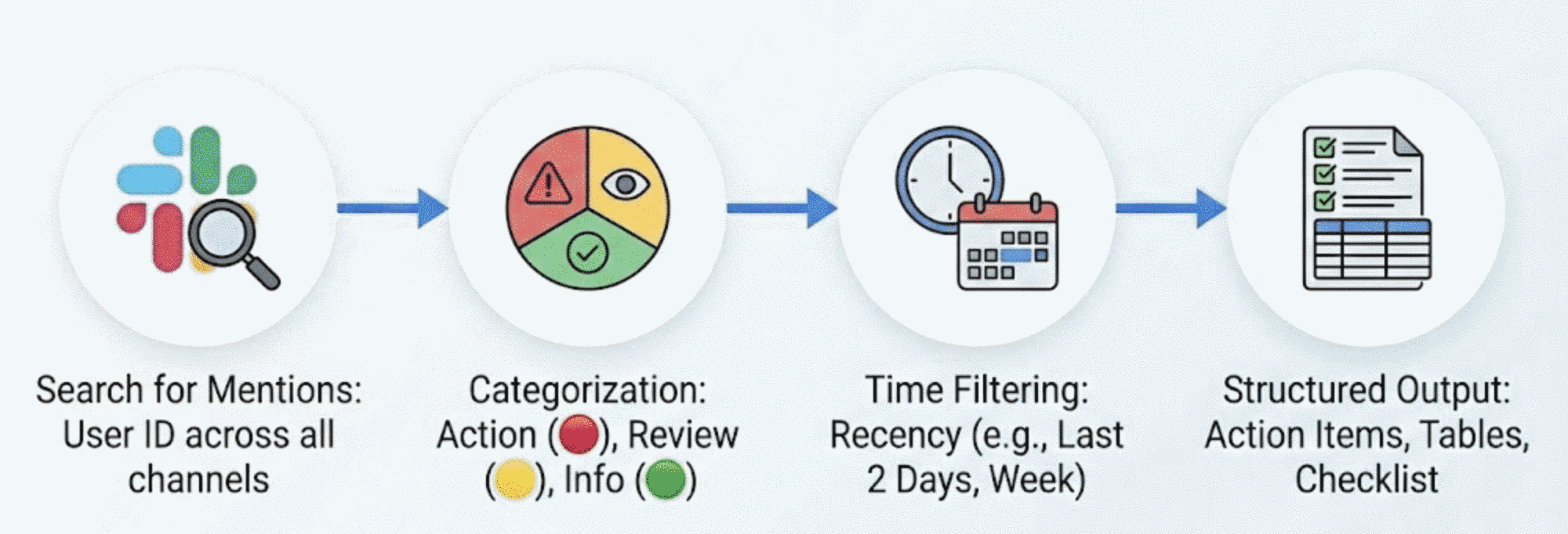 This use-case automates searching and prioritizing Slack messages in which you’ve been tagged, categorizing them by urgency and action required.